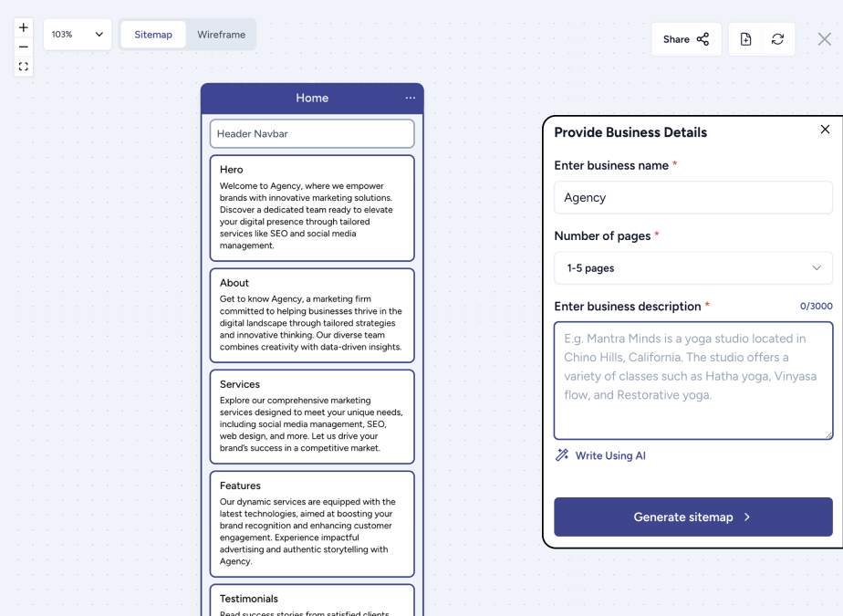 Once your sitemap is ready, AI can generate a wireframe layout for every page so you can see your structure before building it.