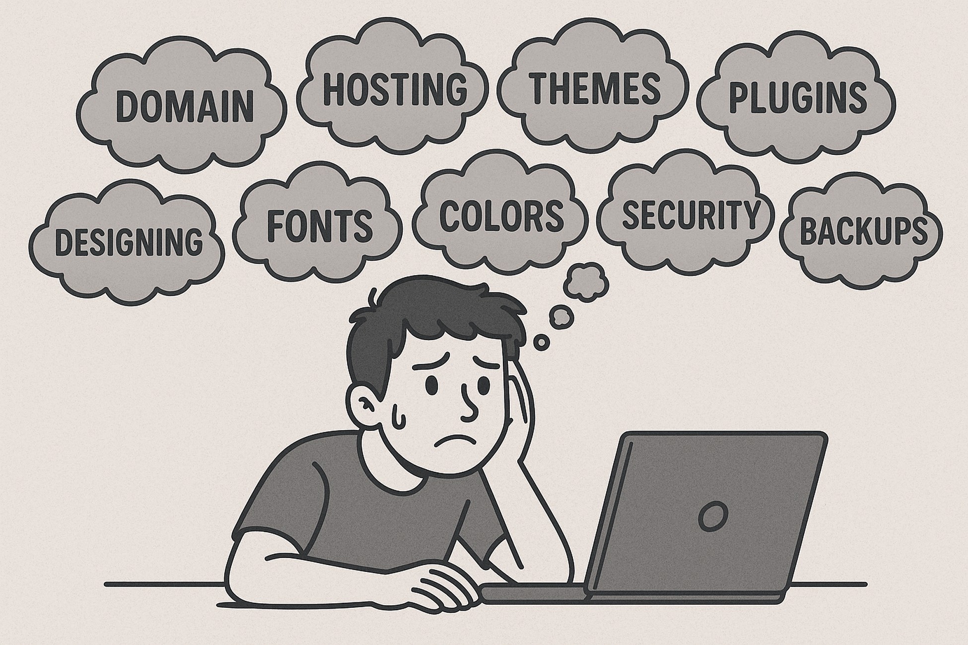 Once WordPress is running, you face a blank site and need to decide on a theme for your design and layout. From there, you install plugins for essentials like SEO, security, forms, caching, and ecommerce.