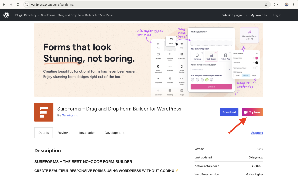 - Go to any WordPress theme or plugin repository page and click on the “Try Now” button.