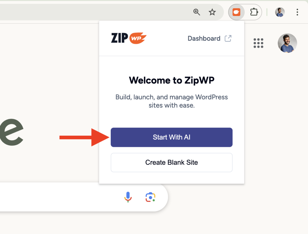 - Click on “Build with AI” in the extension. This will direct you to the ZipWP login page.
