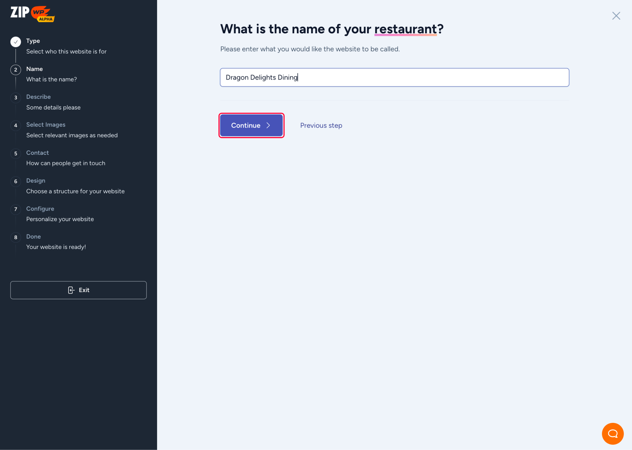 - Name your website and click on the Continue button.